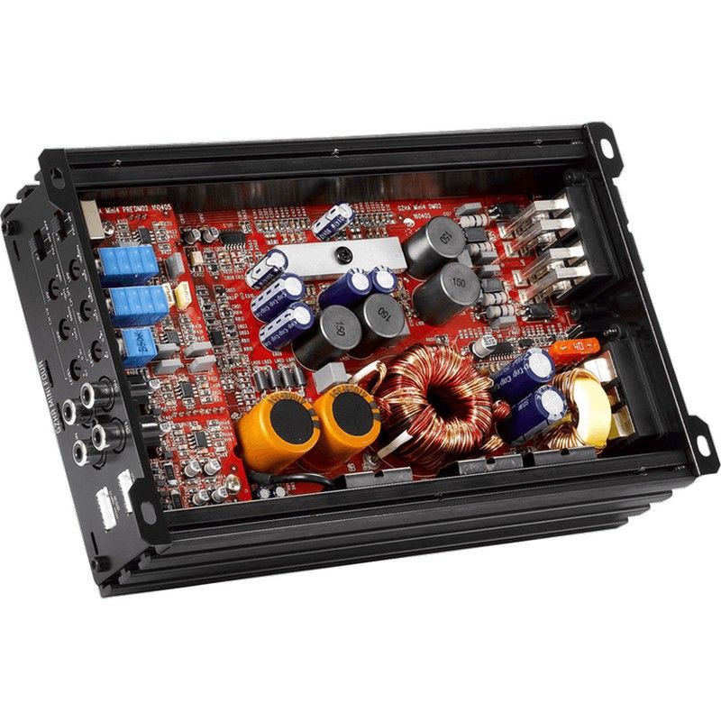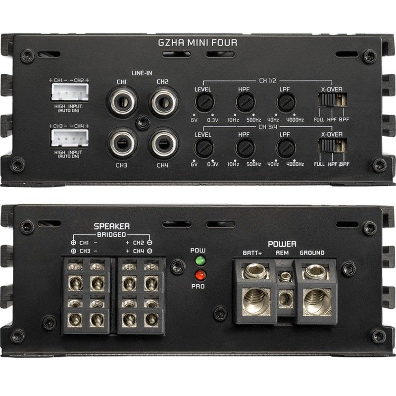 El GZHA MINI FOUR es un amplificador ultracompacto de 4 canales que utiliza tecnología de Clase D de alta eficiencia, lo que le permite entregar una potencia máxima de 640 vatios en un tamaño extremadamente reducido. Este amplificador es ideal para amplificar sistemas completos de altavoces (delanteros y traseros) en vehículos donde el espacio es limitado. Cuenta con un crossover activo variable integrado que permite filtros HPF, LPF y BPF. Está construido con componentes SMD, fuente de alimentación estabilizada y ofrece una integración perfecta en sistemas de audio OEM gracias a su entrada de alto nivel con función de encendido automático (auto-on). Su diseño robusto incluye un disipador de calor sólido con letras grabadas, grandes terminales y una toma para control remoto de nivel con cable.