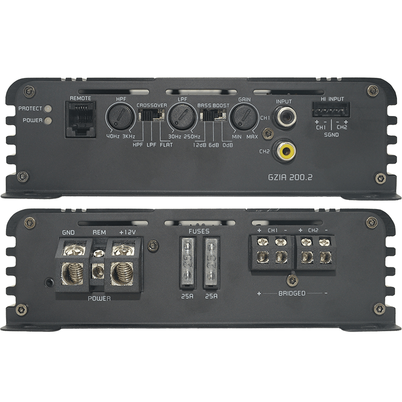 El GZIA 200.2 es un amplificador de 2 canales de alta calidad que utiliza un circuito de Clase A/B, ideal para alimentar un par de altavoces de alto rendimiento o un subwoofer en modo puente. Ofrece una potencia sustancial, con hasta 2 x 220 vatios RMS a 2Ω o 460 vatios RMS puenteado a 4Ω, con una potencia máxima de 550 vatios. Incluye un crossover activo variable, refuerzo de graves (bass boost) y un control remoto de bajos. Su fuente de alimentación es estable y la conectividad a sistemas OEM se facilita con la entrada de alto nivel y la función de encendido automático (auto-on). El diseño es robusto, con un disipador de calor anodizado en negro.