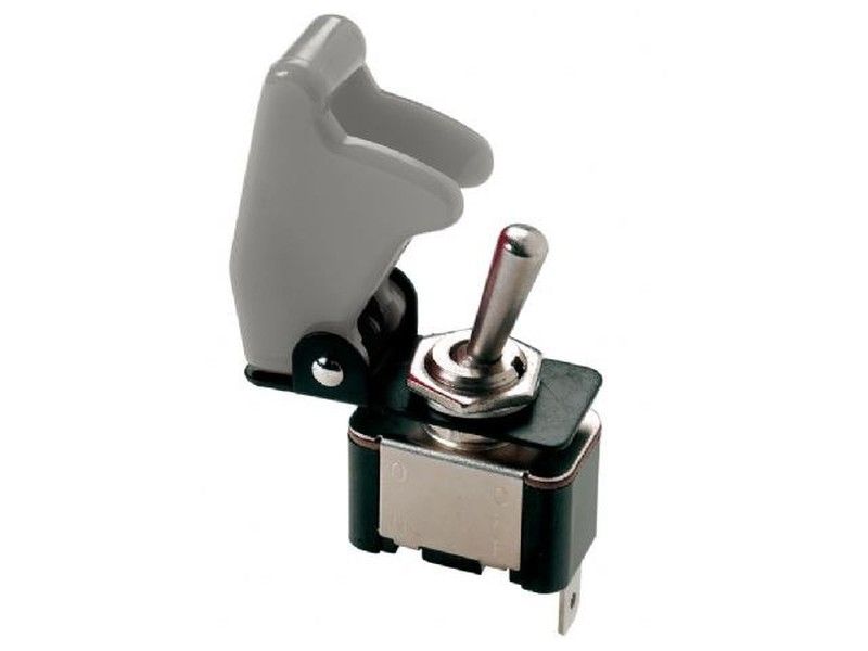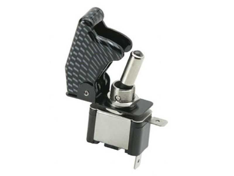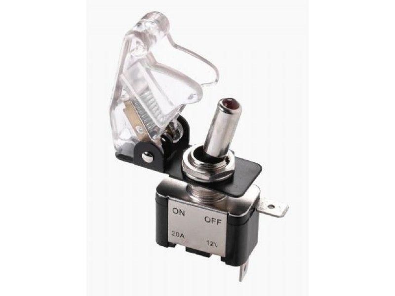 Interruptor Tuning Top Gun de 12 voltios con las posiciones ON y OFF con LED rojo como indicador. Además, viene con una cubierta de plástico al estilo mando de avión para evitar pulsarlo accidentalmente.